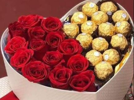 شوكولاتة فاخرة مع ورود حمراء طازجة في علبة على شكل قلب