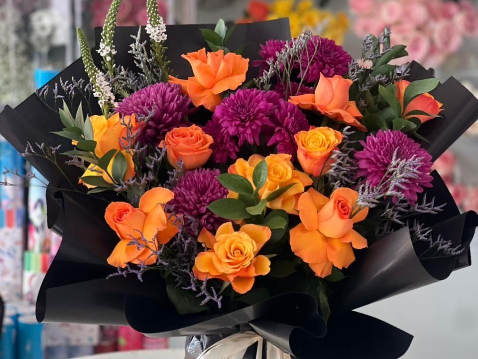 عشر وردات برتقالية طازجة مع زهور الكريسماس الأرجوانية ممزوجة بزهرة الليمونيوم الأرجوانية وأوراق خضراء ملفوفة في غلاف أسود.