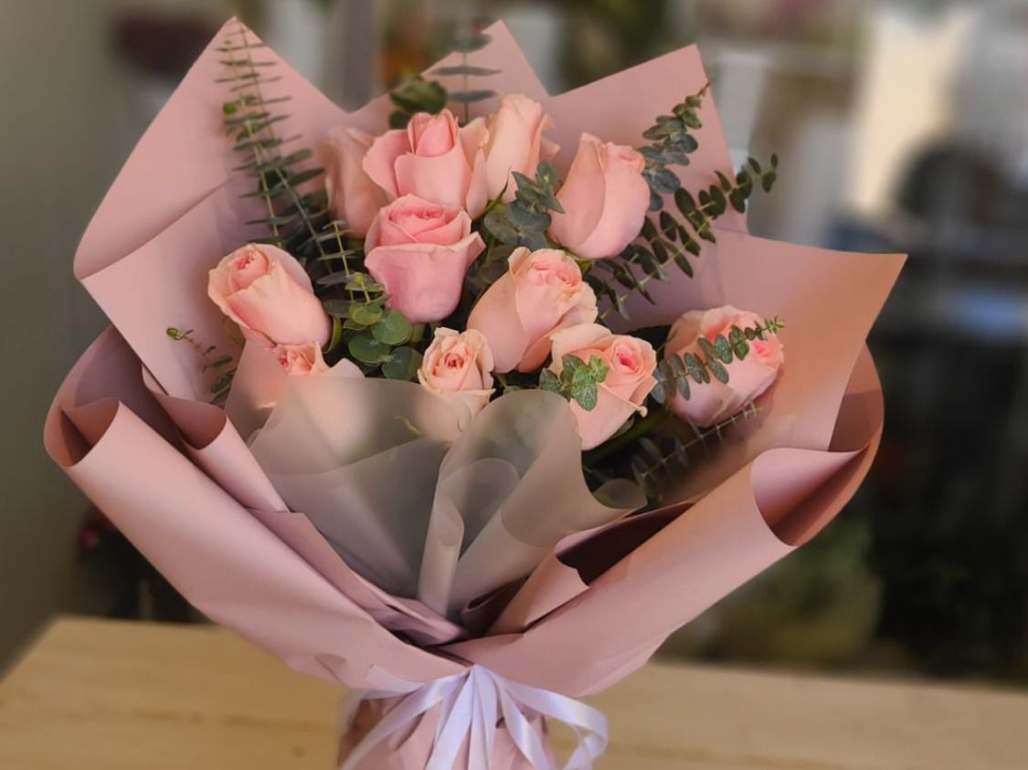 أزهار وردية فاتحة طازجة ممزوجة باللون الأخضر في غلاف فاخر