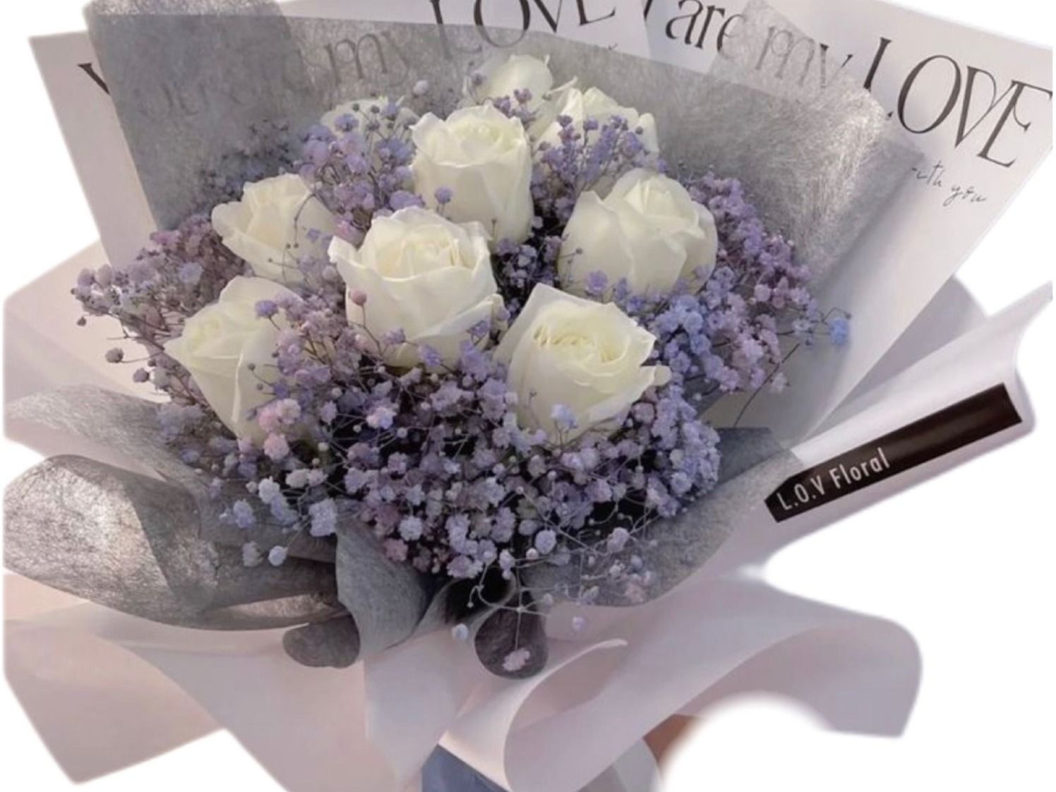 عشر وردات بيضاء مع زهور الجيبسوفيلا الأرجوانية في غلاف أبيض شفاف