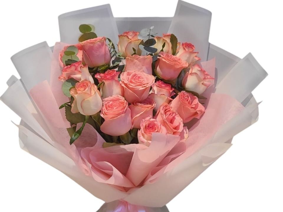 18 Pieces of different pink shades roses in a white and pink wrapping